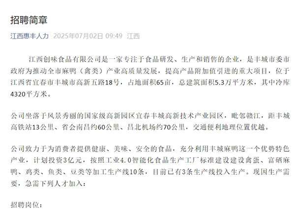 江西創(chuàng)味食品有限公司是一家專注于食品研發(fā)、生產(chǎn)和銷售的企業(yè),是豐城市委市政府為推動(dòng)全市麻鴨(禽類)產(chǎn)業(yè)高質(zhì)量發(fā)展,提高產(chǎn)品附加值引進(jìn)的重大項(xiàng)目,位于江西省宜春市豐城市高新五路18號(hào),占地面積65畝,總建筑面積5.3萬平方米,其中冷庫4320平方米。公司坐落于風(fēng)...